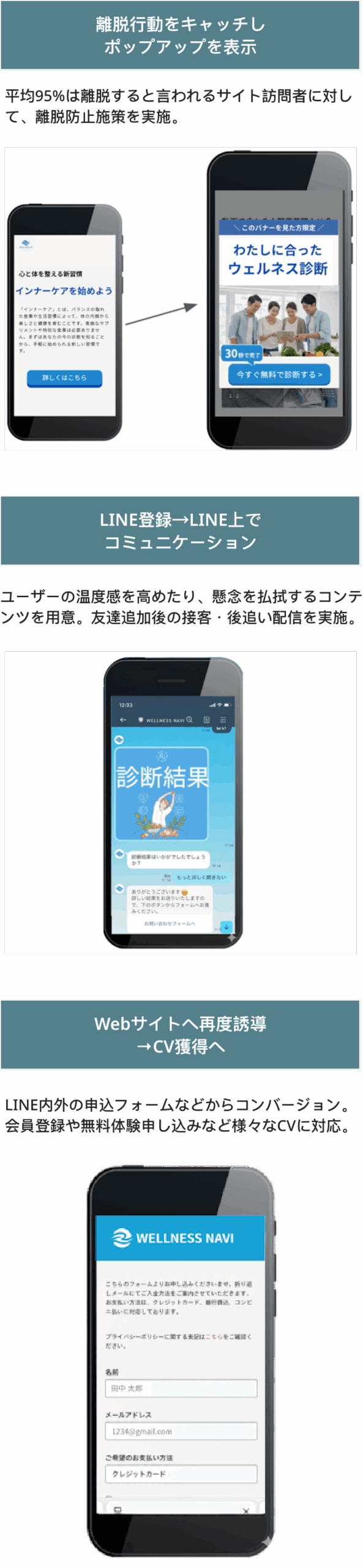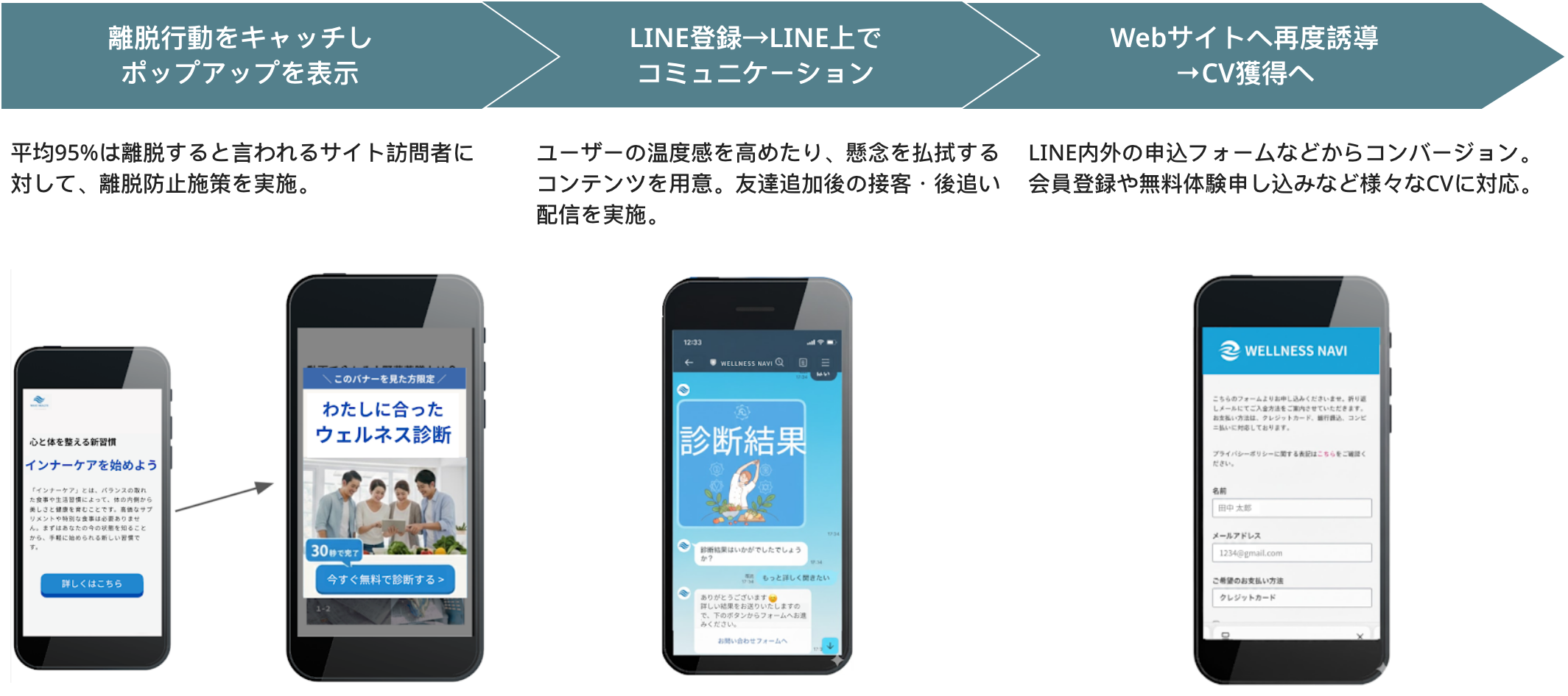 Webサイトから離脱しようとするユーザーに対してポップアップを表示し、獲得したLINEアカウントユーザー(友だち)をナーチャリング。